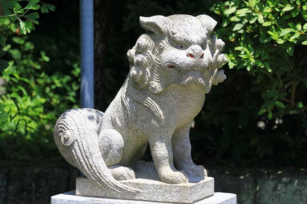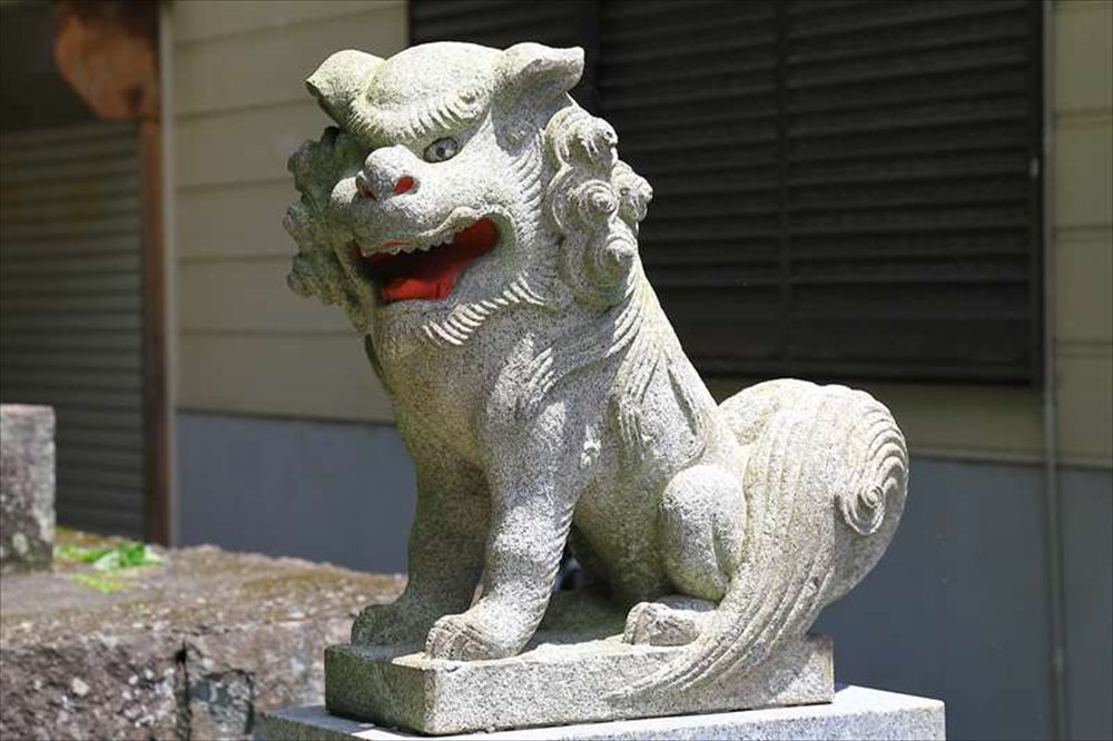 諏訪神社の境内には、特徴的な形をした狛犬があります。 口の中が赤い朱塗りの狛犬は、魔除けや厄除けの効果があるとされており、神社や寺院の建物や神具などにも用いられています。